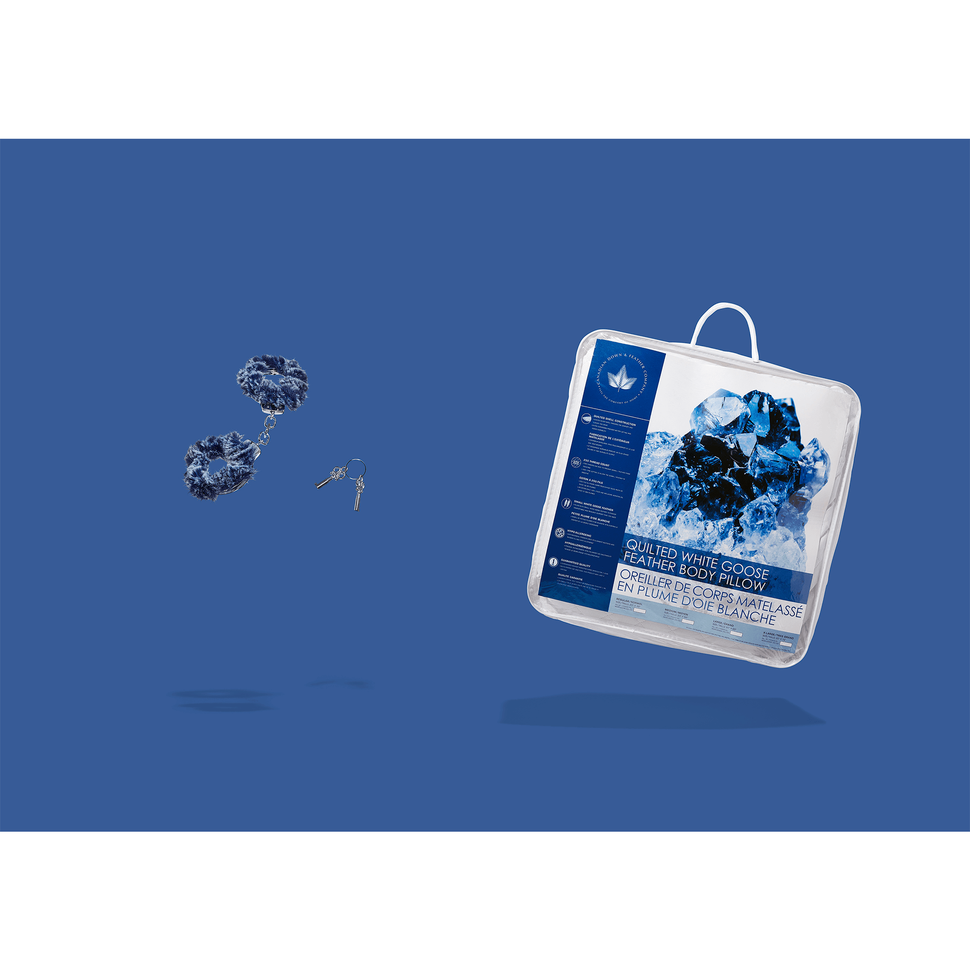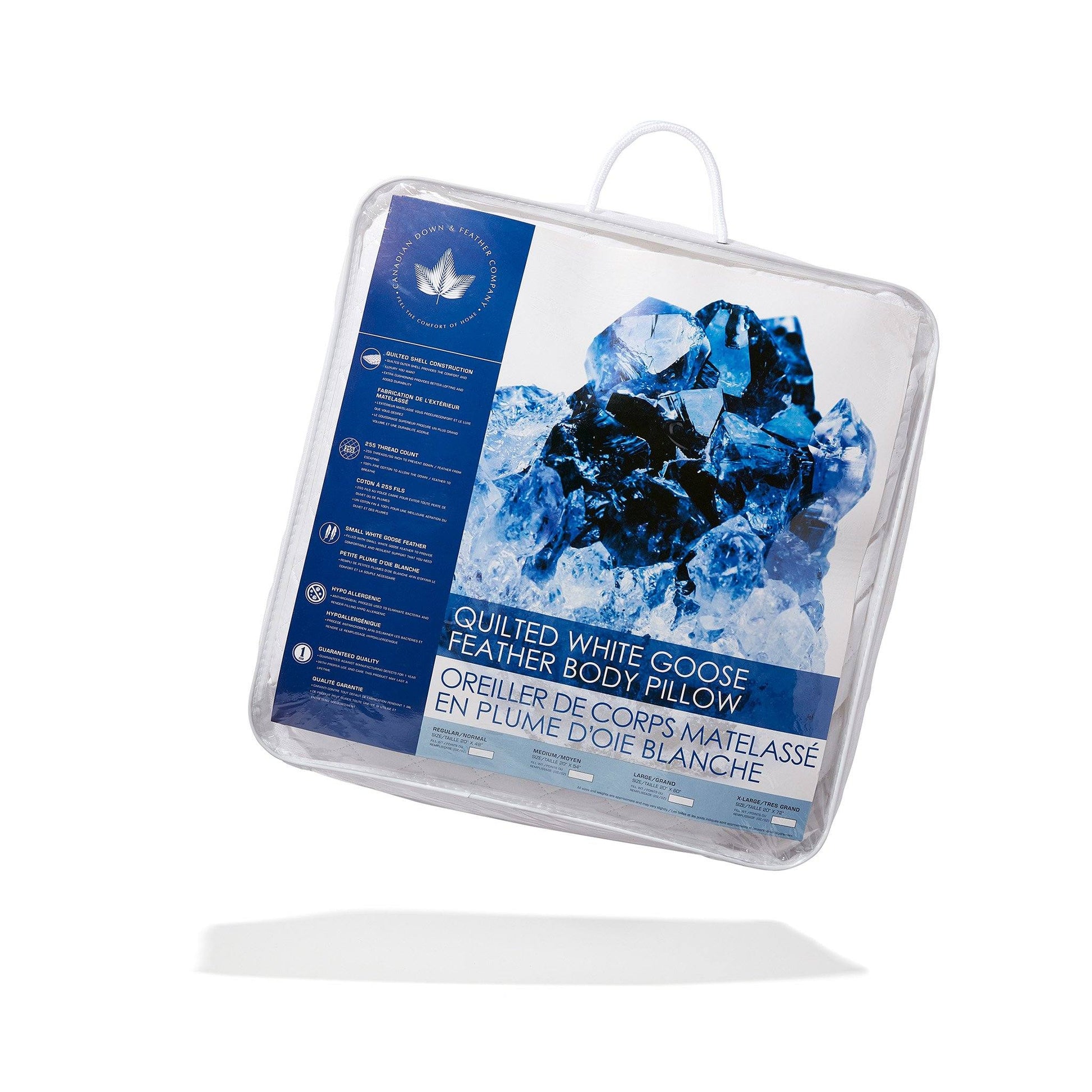 This body pillow is filled with care in Canada. The pillow is filled with goose feather. Feathers provide great support in pillows, due to the feather quills. The outer shell is quilted 255 thread count cotton. The quilting results in a thicker shell, which creates a buffer against the feather, making the quills less noticeable than in a traditional feather pillow.