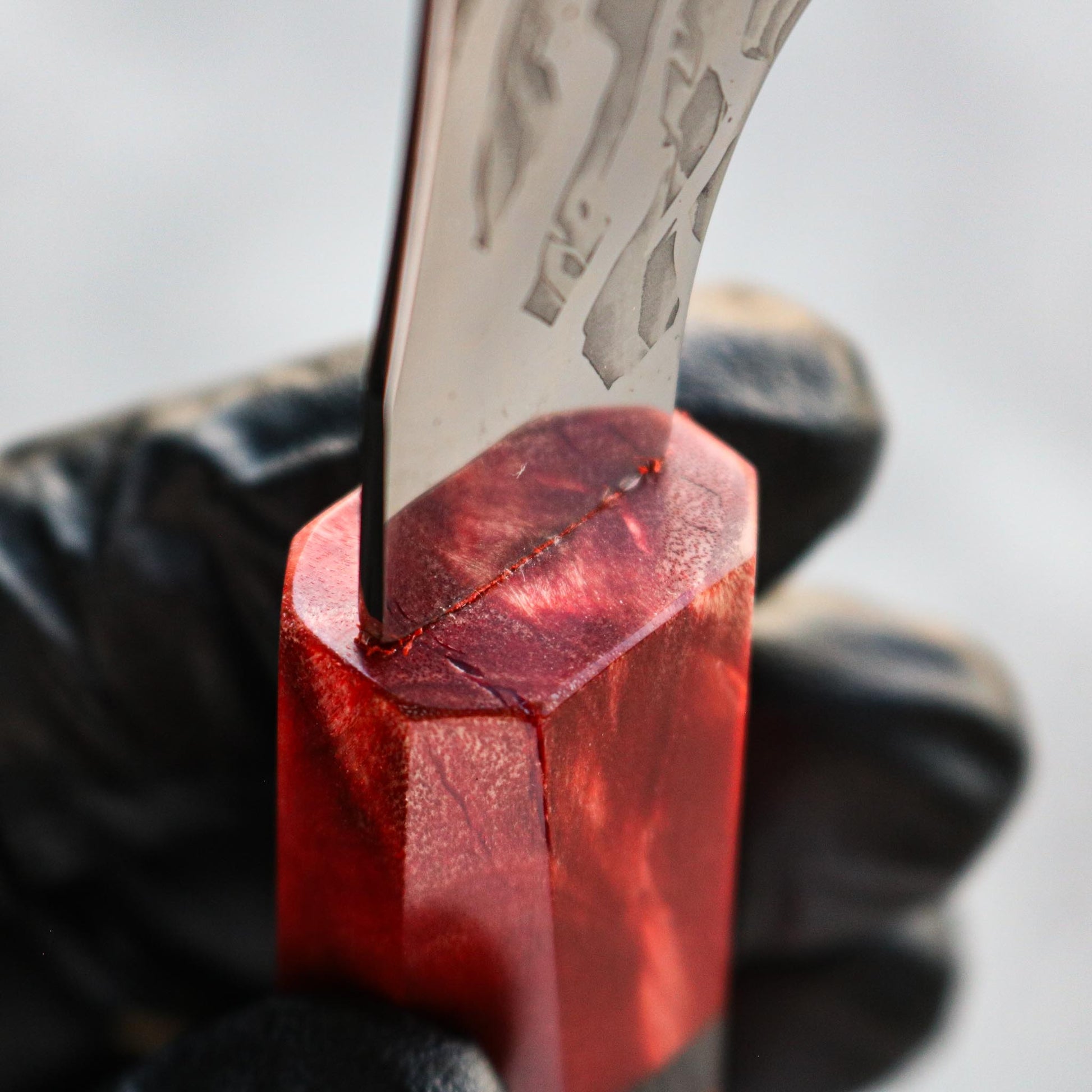 Ryusen Hamono works primarily with SG2/R2, a high powder stainless steel that is very hard and grinds super thin behind the edge. The blades generally have a shorter blade height, which makes them great for precise slicing tasks. Their profiles vary quite a bit, from aggressive sweeping k-tips to more traditional yet modern gyuto shapes. The blades are very consistent, as they employ both modern and traditional techniques, each blade is hand sharpened and impeccably sharp out of the box. Every handle has a unique pattern, particularly the Blazen line, which has a distinctly comfortable taper, compared to the Tanganryu line, which is a hybrid western micarta handle, also with a smooth finish.