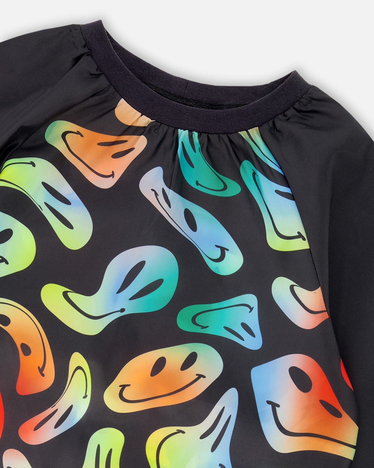 Make art class your most stylish moment of the day with our smiley face print smock. In fabric made from recycled plastic bottles, this eco-friendly school apron features a long raglan sleeve silhouette with double front pockets, a round neckline, elasticated wrists, and a water-resistant finish..