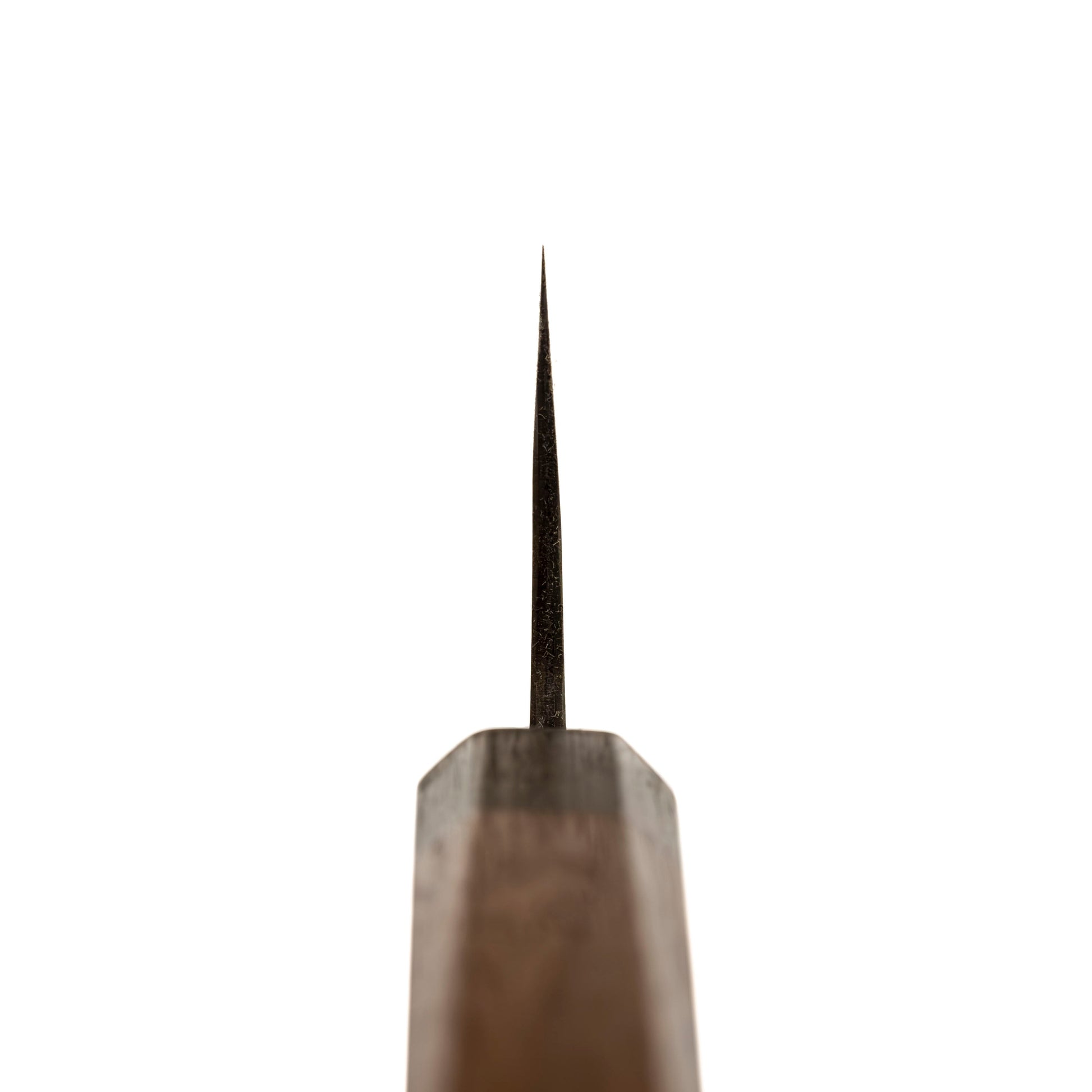 The gyuto is an all purpose knife and is the Japanese equivalent of the western chef's knife. While they normally have a flatter profile than a western style chef's knife with more of an upturned tip meant for an improved rocking motion, this one is somewhere in between with a smooth swept belly and a good sized flat spot for chopping. The height of the blade combined with the hybrid profile makes this an incredibly versatile knife. These knives are very thin and have a high grind making them perform very well, it should be noted that this thinness will make this knife more delicate and should be used with caution. Please carefully read the care instructions found below to ensure you don't cause damage to the knife through user error.