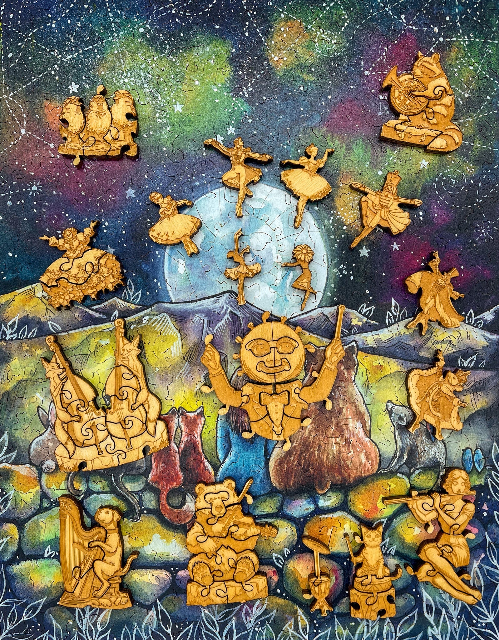 Introducing “The Evening Concerto,” a wooden puzzle that reveals a serene evening setting where orchestra members retire to ancient stones, facing majestic mountains under a stunning night sky. The moon rises, casting a tranquil glow, while stars and constellations shimmer above, composing a silent symphony. This peaceful scene captures the essence of nature’s own performance, blending the beauty of the cosmos with the harmony of music, as “The Evening Concerto” finds peace in the calmness of the night.