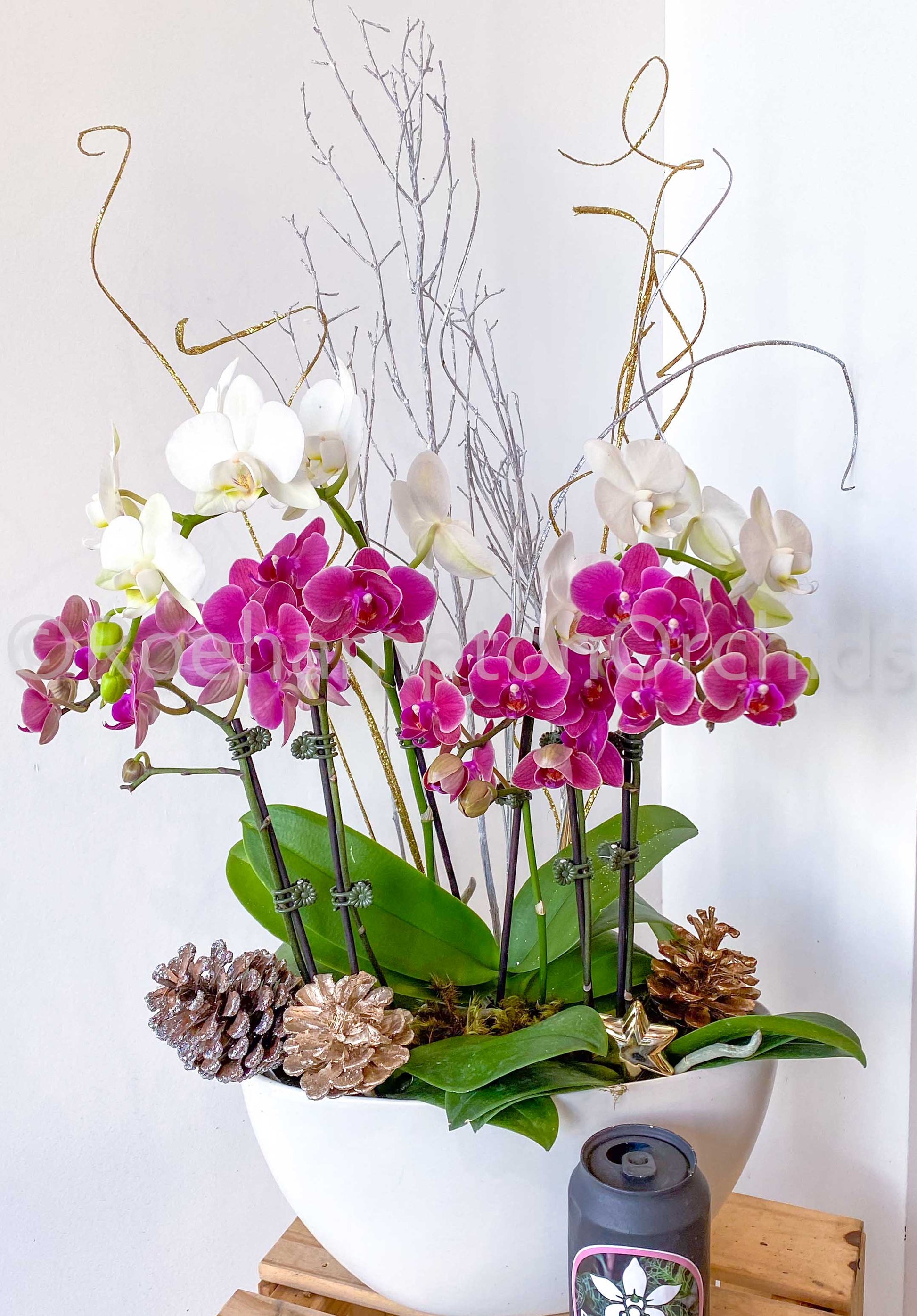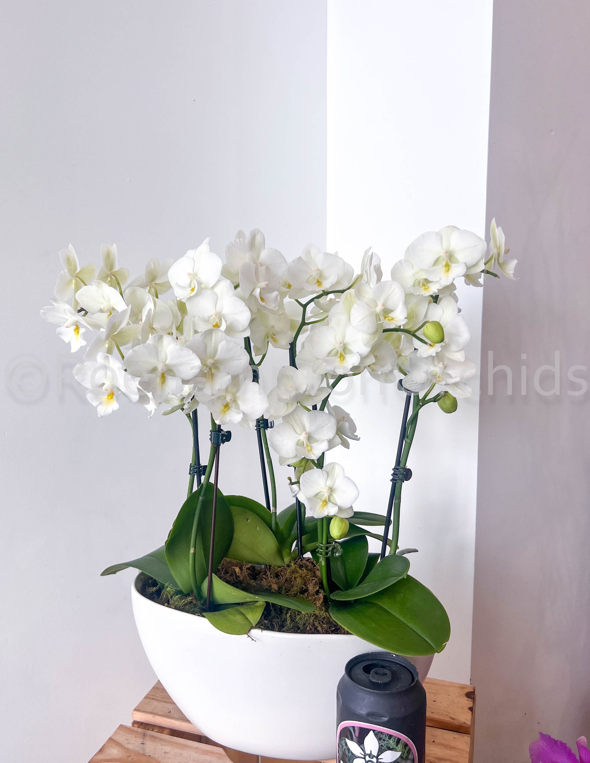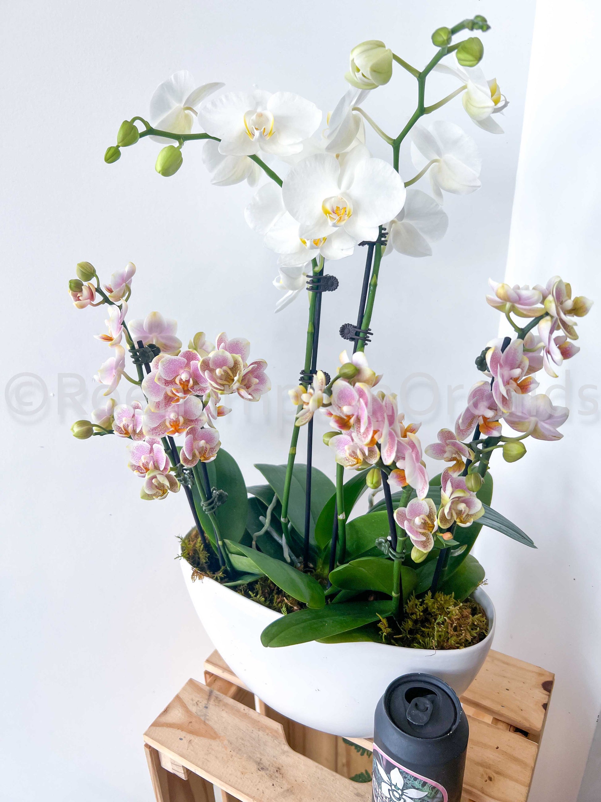 - 💧 Watering an arrangement: Water when completely dry. When watering, spray 1/4 (Small Orchids) to 1/2 (Large orchid) of a cup of water into the inner pot every 10 days until blooms fall. Then remove and grow individually with soaking method.