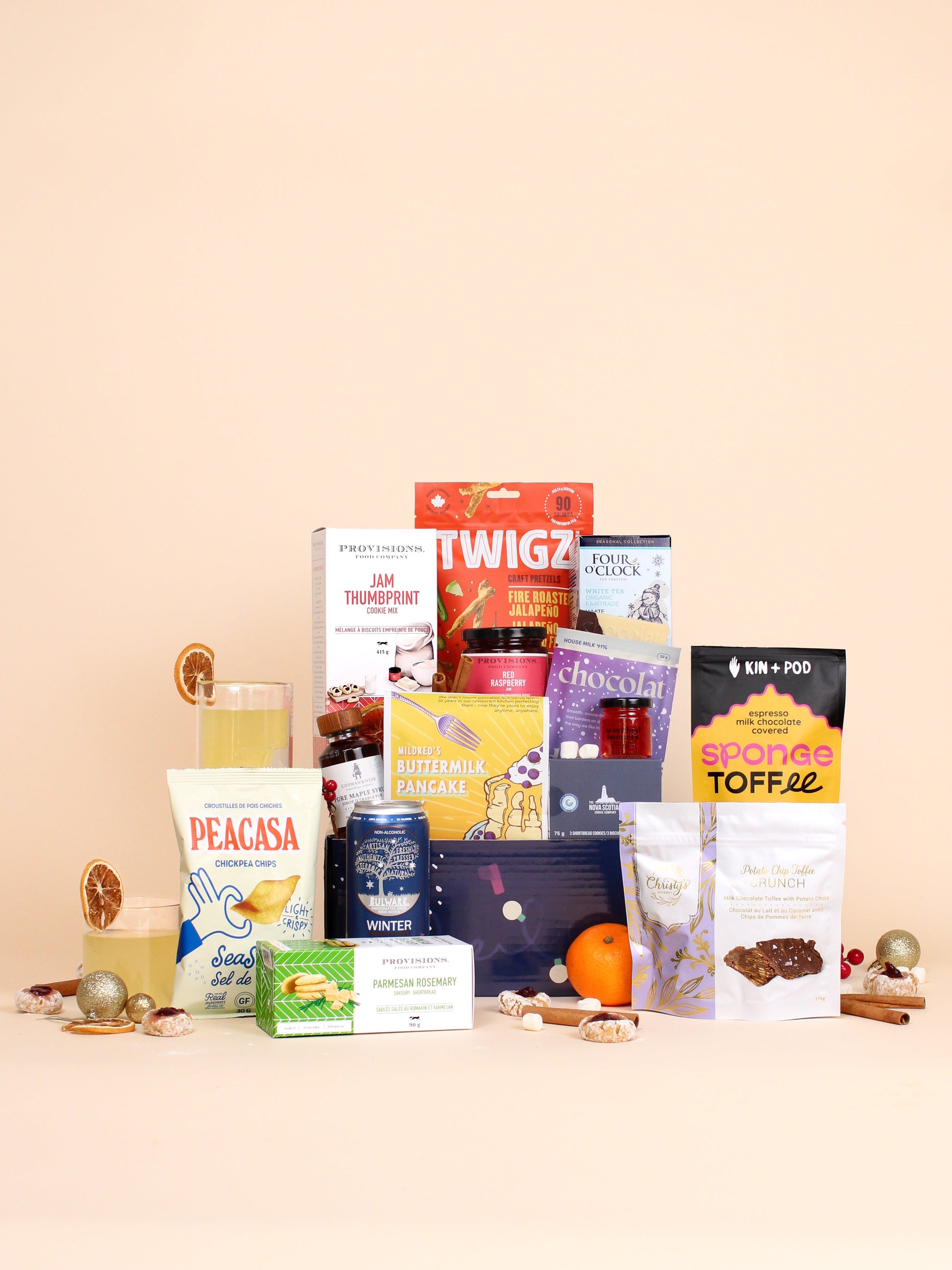 This holiday gift box is overflowing with festive flavours to share and savour. Inside are Canadian-made delights — cookie mix, thumbprint cookies, jams, maple syrup, teas, and seasonal drinks — all ready to enjoy or bake at home. A joyful gift that celebrates the season with every bite.