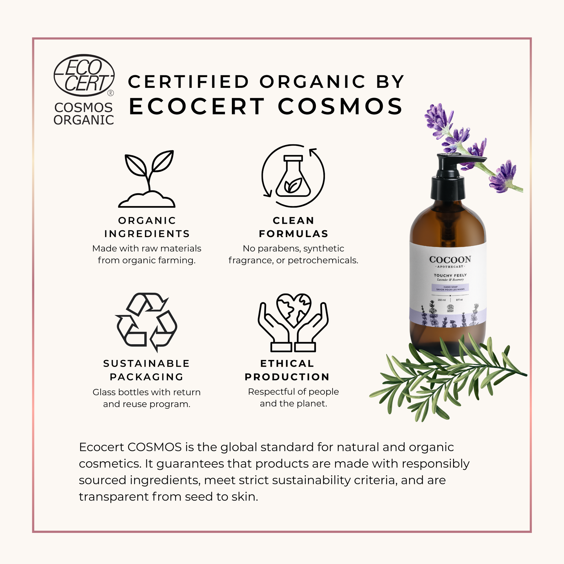 Certified organic by Ecocert COSMOS, guaranteeing natural and sustainable ingredients