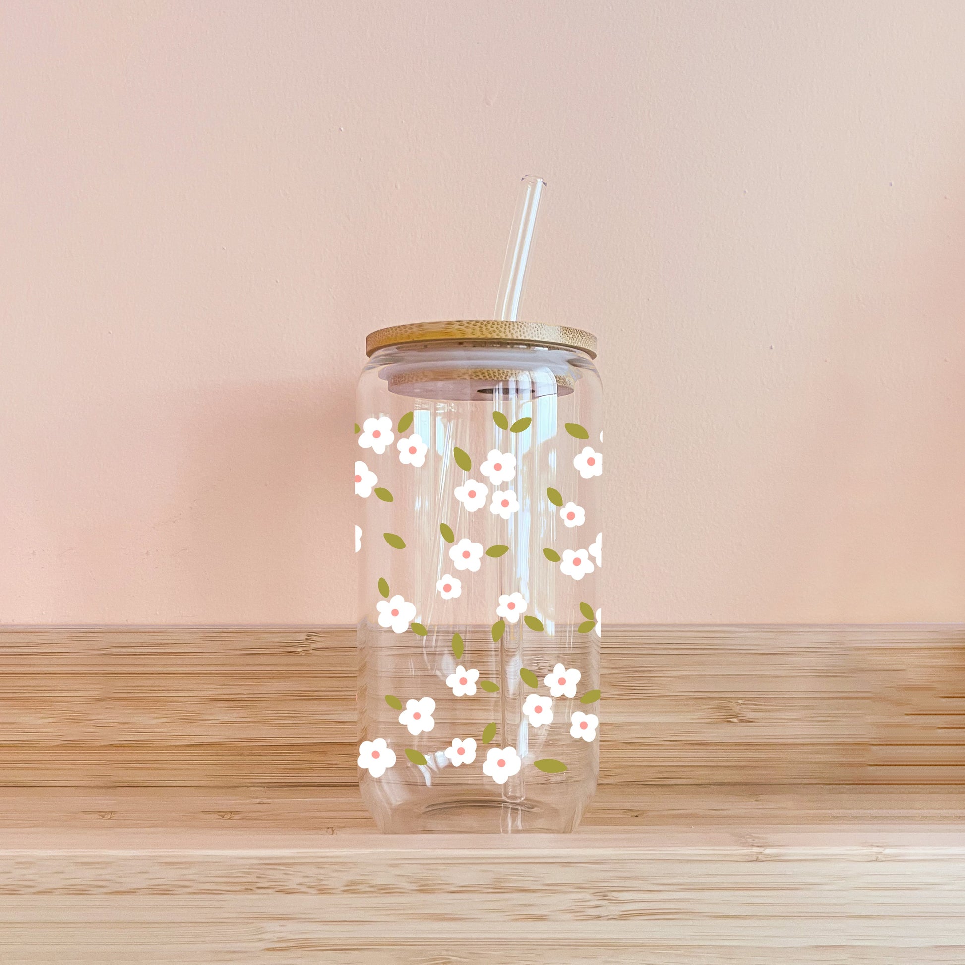 🌸 Verre 16oz avec couvercle en bambou et paille en verre