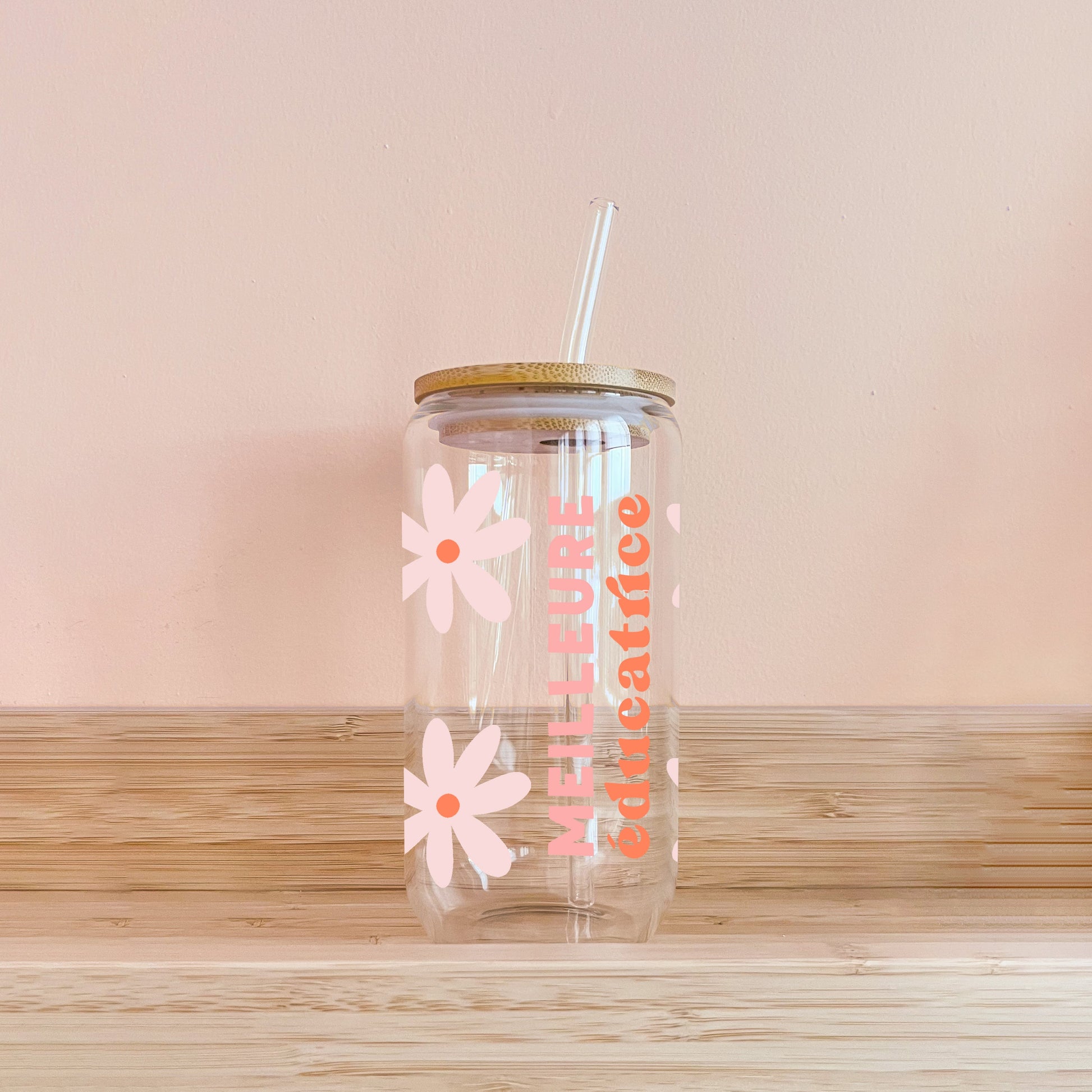 🌸 Verre 16oz avec couvercle en bambou et paille en verre