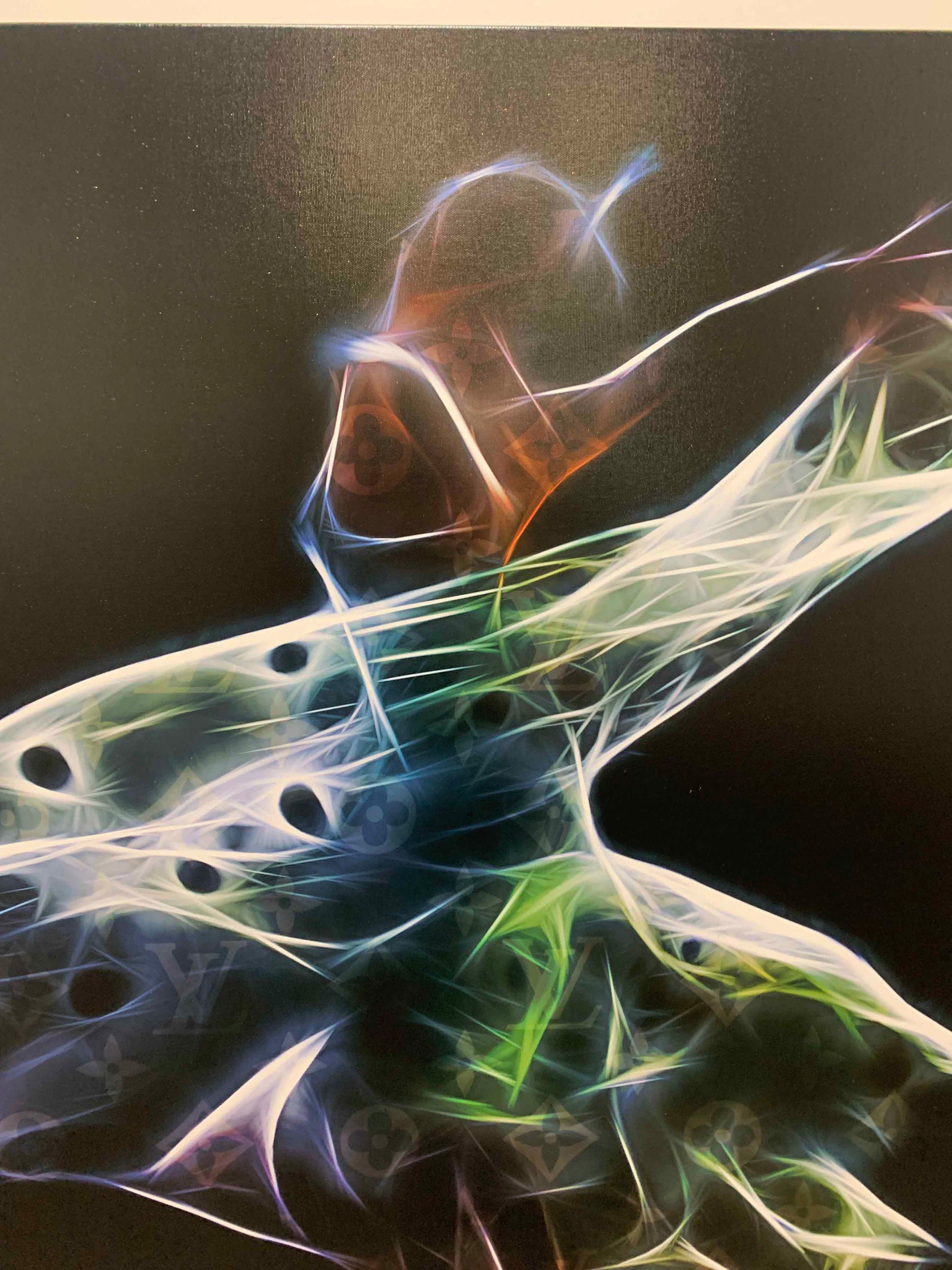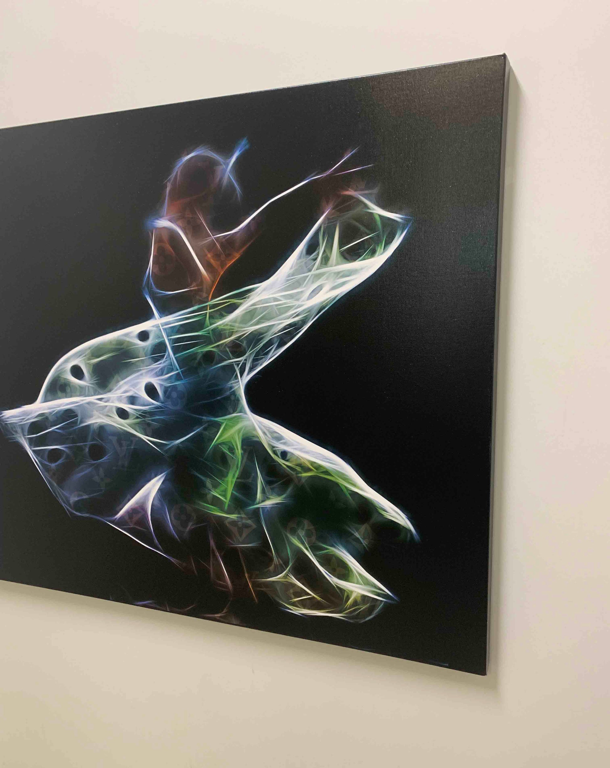 Canvas " Rumi". The shimmering finish and ethereal image of a woman dancing with arms extended and holding her flowing dress against a striking black background will transport you to a world of enchantment and allure. Enhance your space with this captivating piece of abstract wall art.