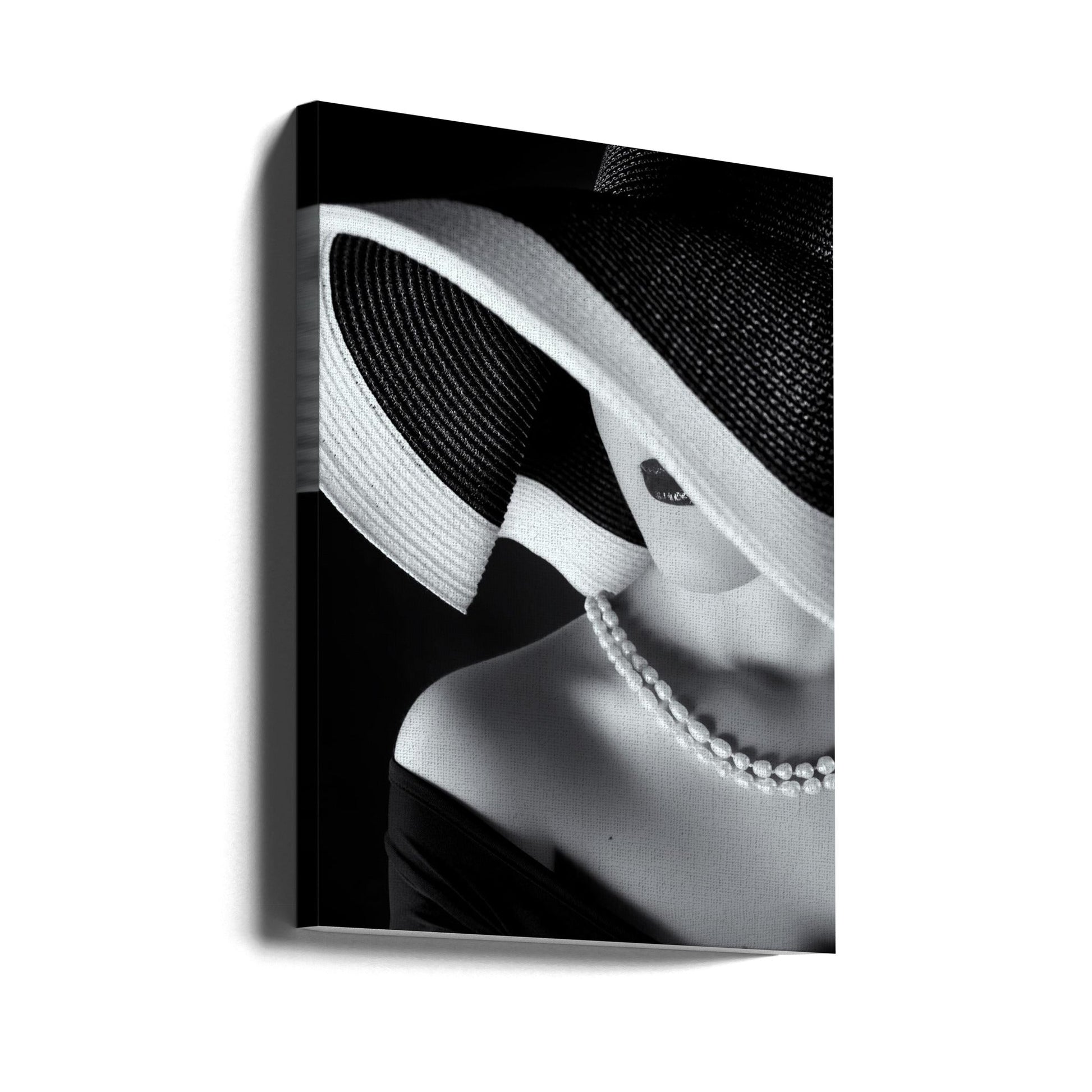 Wall art Elegance in Shadow by Ruslan Bolgov. Black and White photo of a woman's face covered by a large hat. Made in Canada for those who expect the best, our high-resolution canvas prints showcase exquisite craftsmanship, premium materials, and a finish that makes every detail shine.