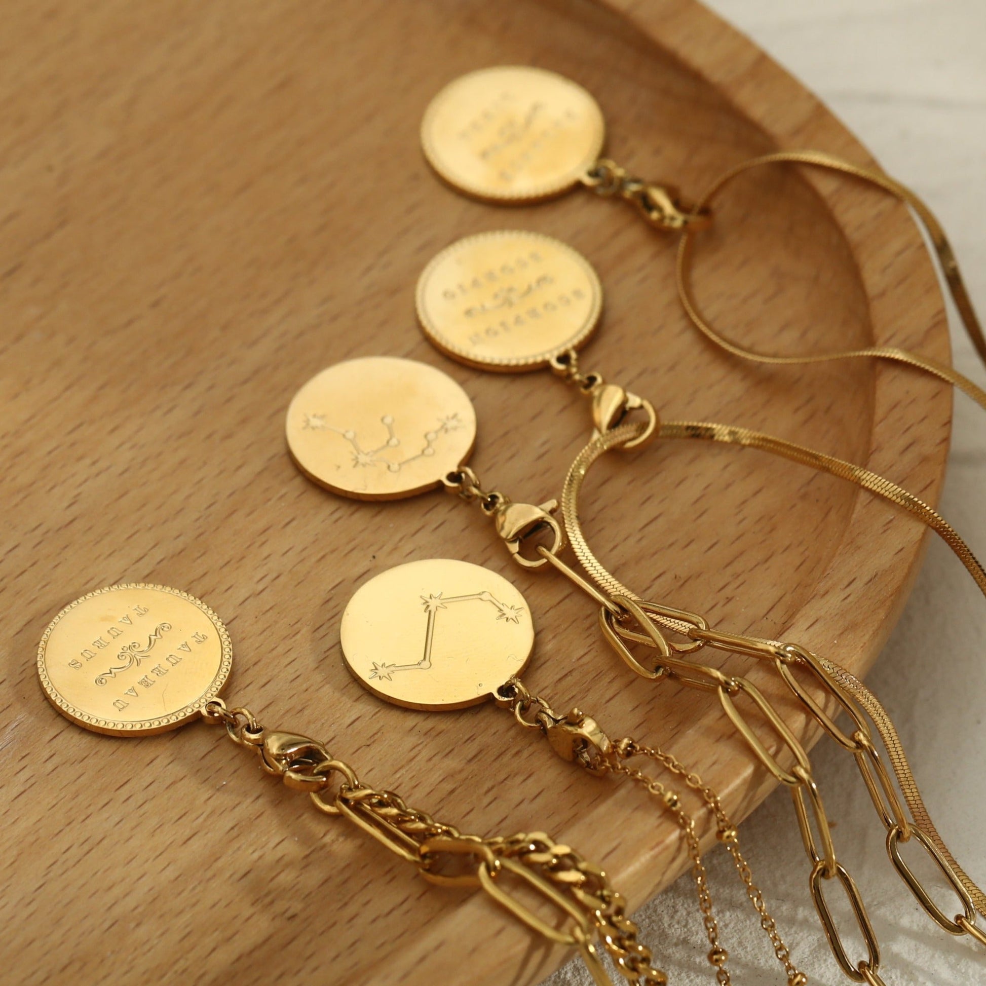 A ZODIAC charm that you can wear on either side: One side shows the constellation and the other side has the star sign written in English & French.